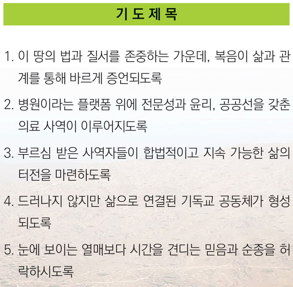 병원은 중립적 공공 영역으로서 지역 사회의 공공선을 위해 의료를 제공해야한다. 우리는 외부에서 들어온 기관이 아니라, 지역 사회와 함께 살아가며 섬기는 병원이 되기를 지향한다. 의료 현장과 일상의 자리에서 맺어지는 관계 속에서 복음이 자연스럽게 흘러갈 수 있다고 믿는다. 병원 사업은 약 3년 전부터 실무팀이 현지에 들어와 준비를 이어오고 있으며, 약 12명의 사역자들이 의료, 행정, 기획 등 각 영역에 직접 참여하고 있다.